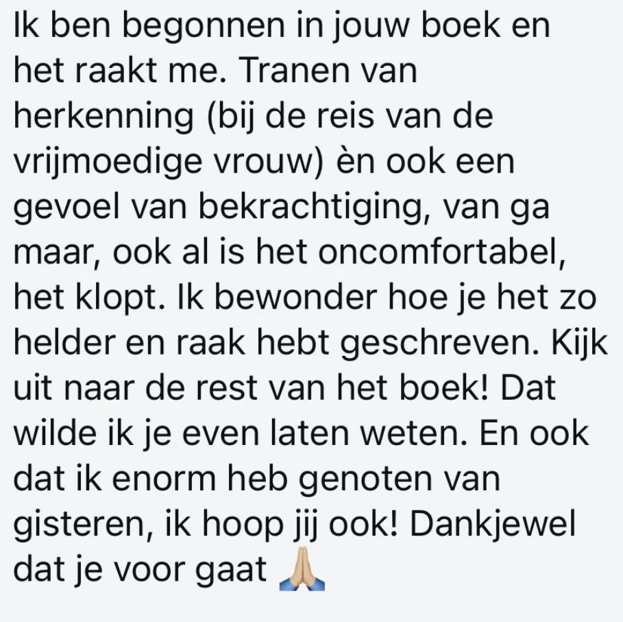 En nu mocht er ook een club komen. Voor de vrouw die de beweging wilt maken van weten naar zijn. Worden wie je werkelijk bent gaat via de reis naar binnen. Elke keer opnieuw. Ik weet als geen ander hoe taai, waarachtig en geweldig dat is. Met The Brave Club breng ik het boek tot leven en creëer ik een plek voor iedere vrouw die haar volwassen en vrijmoedige zelf wilt ontmoeten en verankeren. Zodat je niet meer probeert te voldoen — maar leert volgen wat leven wil door jou heen. Aanwezig zijn in deze club gaat je zoveel (levens)lust, (zelf)liefde en lekker(heid) brengen. Dat laatste woord bestaat volgens mij nog niet, nou bij deze.